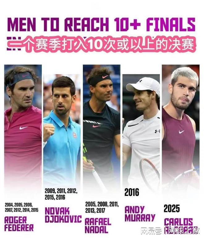 上海大师们状况良好,上周结束的事件仍然值得我们库存。阿尔卡拉斯击败了弗里茨,并在本赛季的个人决赛中的第八次赢得了冠军。在个人表现方面,他再次与数据中的巨人进行了比较,以吸收这些世纪球员的表现库存,总共有5名男性球员一次达到10个以上的决赛。除了又名,其他四个人没有什么不同,但是四个巨人Fernardmu。费德勒(7次)费德勒(Federer)领先7次,他在2004年至2007年的不稳定表现上赢得了7次冠军。在2008年获得纳达尔(Nadal)在2008年获得纳达尔(Nadal)之后,他在2012年获得了温布尔登冠军,并超越了样品,成为了KA KAKAGRAND SLAM SLAM TALLES最多的球员。他还可以双打进入决赛。在2014-2015的背靠背赛季,即使他再次进入了许多决赛,他也没有在大满贯冠军赛中得分这是连续两年的温网决赛中的德约科维奇的损失,令人难过。 Djokovic(5次),纳达尔(5次),达娜分别有五次。其中,德约科维奇(Djokovic)在2011 - 2012年和2015-2016连续连续10次赢得了10次以上的决赛,证实了其强大的耐力。近年来,即使他在一个赛季中也赢得了三个大满贯冠军,但由于他的时间表最轻,他并没有在决赛中加倍。纳达尔(Nadal)于2005年开始比赛,当时他首次赢得了大满贯冠军,并在包括法国公开赛在内的各种赛事中赢得了许多冠军。在2008年和2013年,他也获得了奖项。更令人惊讶的是,它被认为是最强大的一年,但不再列出。默里(1小时)是为什么默里反复被称为第四巨人的原因,因为他在自然一年的高潮中表现出色。那一年,他进入了比赛的决赛,并最终在年底和世界上获得了第一名。阿尔卡拉斯(1小时,2025年)阿尔卡拉斯本赛季进入了10个决赛:鹿特丹,蒙卡,巴塞罗那,罗马,法国公开赛,德尔·雷伊,温布尔登,辛辛那提,美国公开赛,东京。他刚刚输给了巴塞罗那(在鲁尼击败)和温布尔登(失利);获胜的对手包括SI,Musetti,Fritz和其他强大的球员,据说这是他首次亮相以来最强的时光。 (资料来源:带网球之家套装:Luo Cheng Qiye)